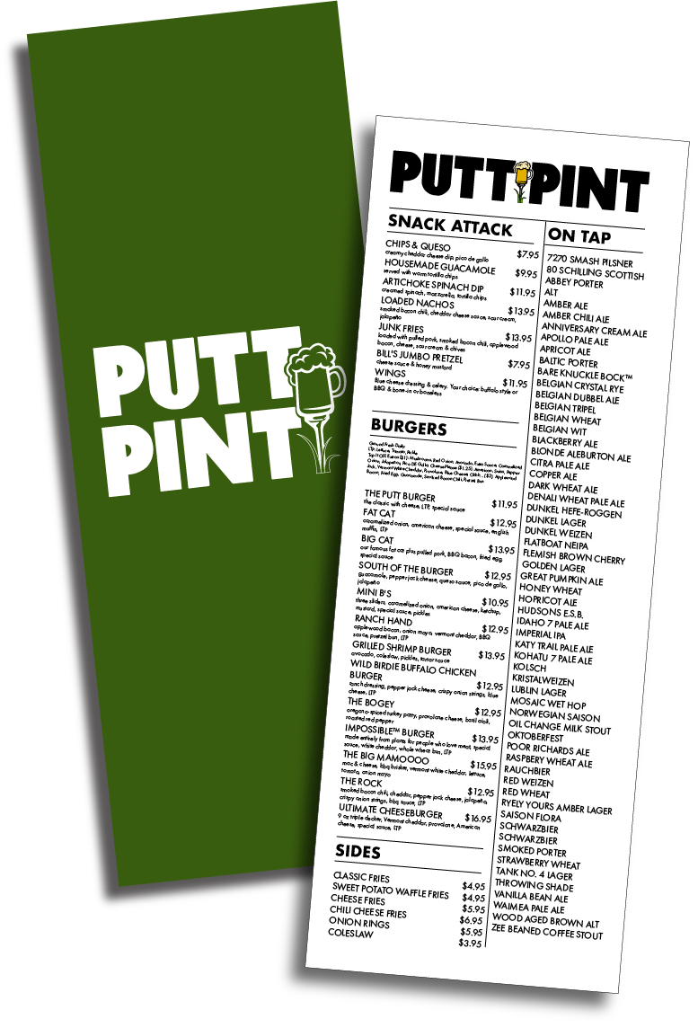 Putt Pint is the perfect bar for a family outing, date night, or to just hang with your friends. Putt Pint is the perfect restaurant to sit and have a drink while putting with your favorite pals! (Completed as undergraduate project)